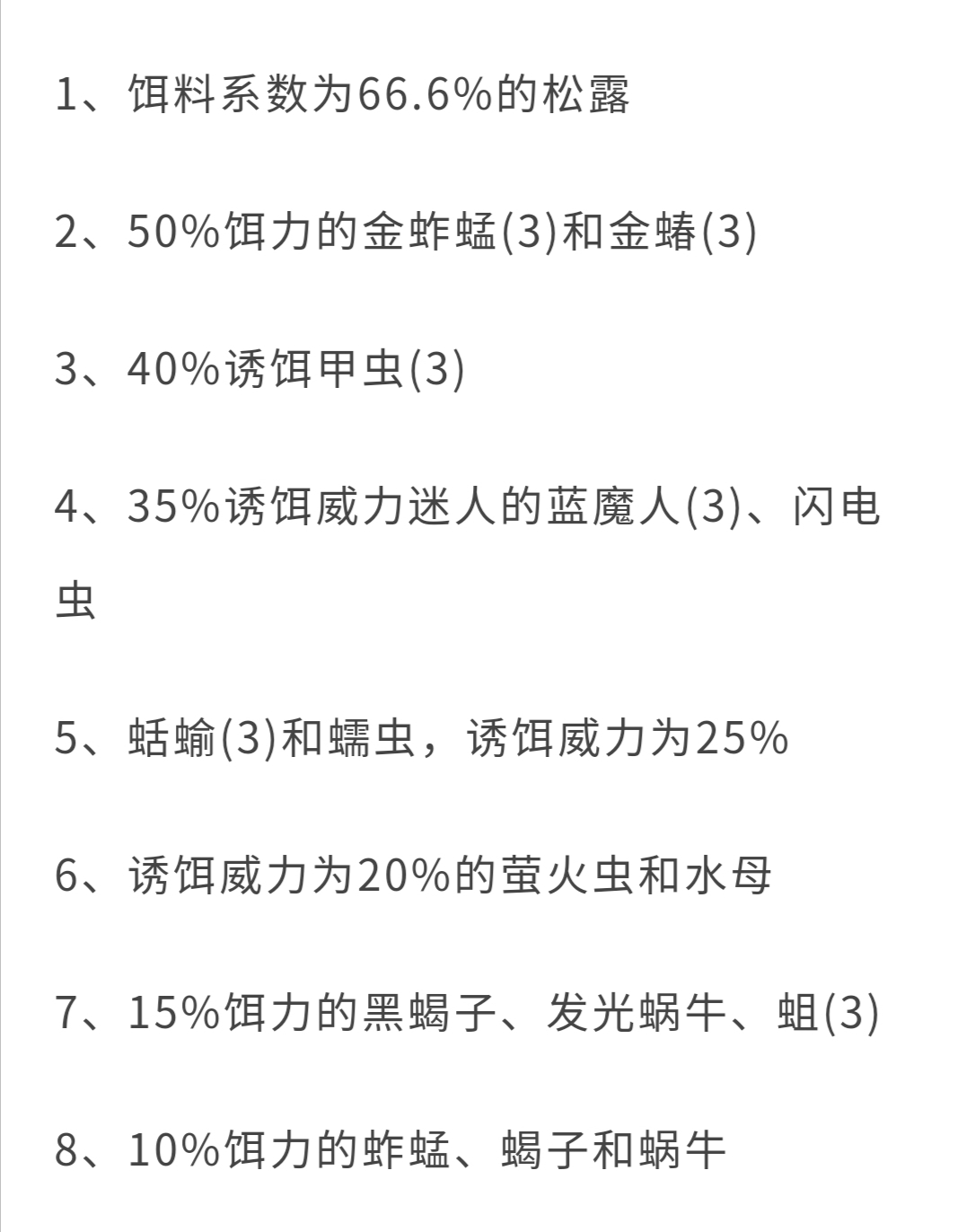 首頁 泰拉瑞亞 問答 泰拉瑞亞釣魚實用魚餌有哪些? 2022-11-09 根據泰拉瑞亞遊戲官網,餌料係數為66.6%的松露,50%餌力的金蚱蜢(3)和金蝽,40%誘餌甲蟲,35%誘餌威力迷人的藍魔人、閃電蟲,這些都是實用魚餌。如圖所示: