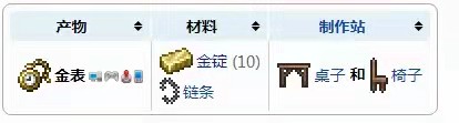 在遊戲《泰拉瑞亞》中,金懷表需要用10個金錠、1個鏈條在桌子和椅子處合成,作用是能夠在遊戲界面上顯示時間。