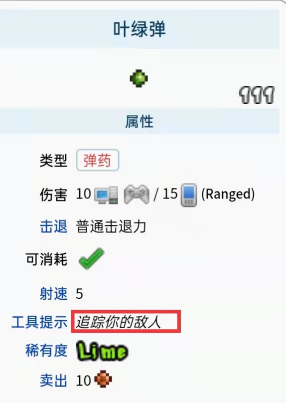 首頁 泰拉瑞亞 問答 泰拉瑞亞子彈怎麼跟蹤? 2022-11-10 跟蹤子彈介紹:在遊戲《泰拉瑞亞》中,跟蹤子彈是指葉綠彈,是能在空中迅速改變運動軌跡甚至轉向,以達到追蹤敵怪的效果,這些子彈會以最近的敵怪作為目標,如果該敵怪已被擊殺,滯空的剩餘子彈則會繼續追蹤第二個最近的目標。