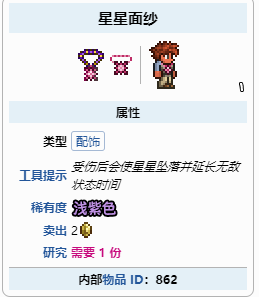 星星面紗不能合成物品,推薦比射手和法師們受到傷害更多的戰士們使用。直到到達玩家的高度之前,墜落之星會穿過所有物塊,之後會持續墜落到碰到物塊為止。同時也會使玩家受到傷害後的無敵時間加倍,從2/3秒(0.67秒)到4/3秒(1.33秒)。