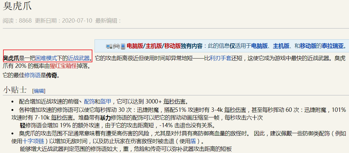 泰拉瑞亞臭虎爪普通模式沒有,僅限於泰拉瑞亞困難模式。泰拉瑞亞臭虎爪可以視為困難模式之前利刃手套的升級版,很厲害。