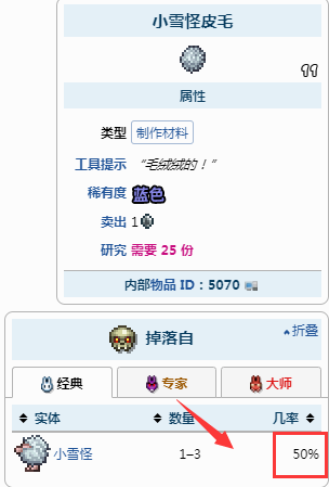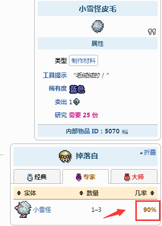 首頁 泰拉瑞亞 問答 泰拉瑞亞小雪怪皮毛掉落概率是多少? 2022-11-10 小雪怪皮毛是一種製作材料,由小雪怪掉落,小雪怪是一個可以在冰雪生物群落找到的敵怪。經典模式中有50%幾率掉落1–3個小雪怪皮毛,大師、專家模式有90%的幾率掉落1–3個小雪怪皮毛.