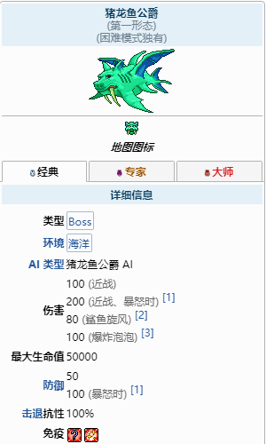 豬鯊是泰拉瑞亞困難模式中的boss,在攻擊過程中共有兩種形態,不同形態的屬性也有所變化,具體的數值如下圖所示。