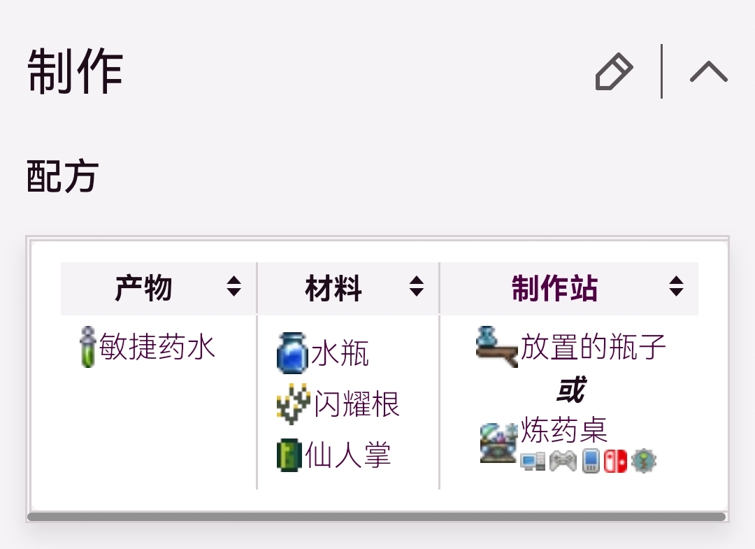 敏捷藥水是用一個水瓶,一個閃耀根和一個仙人掌在放置的瓶子處或者煉葯桌處進行合成。水瓶是用瓶子在有水的地方進行製作的,閃耀根在地下洞穴處可以找到仙人掌在沙漠上可以找到,在合成時建議在煉葯桌處進行合成,因為煉葯桌有33%的幾率讓你不消耗材料合成。