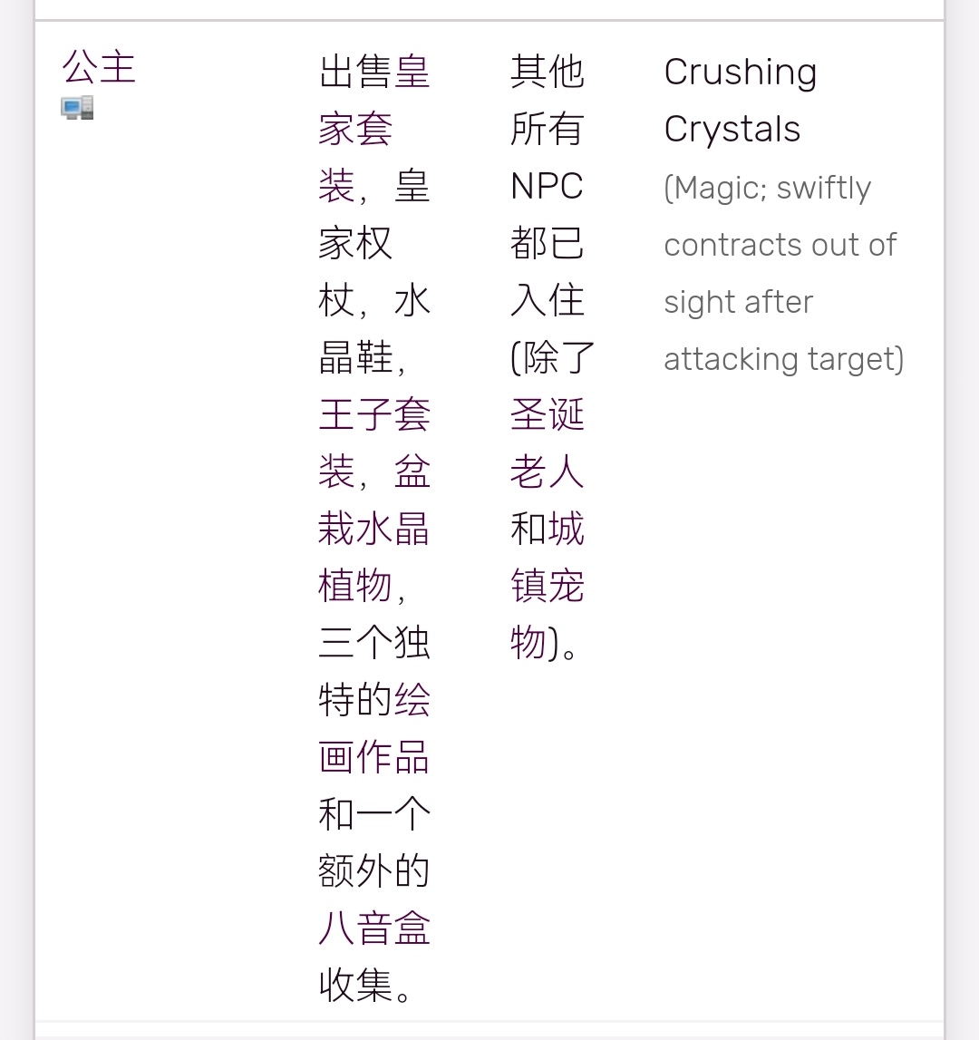 首頁 泰拉瑞亞 問答 泰拉瑞亞最後一個的npc是誰? 2022-11-11 在電腦版本上,最後一個出現的NPC是公主,但要求其他所有的NPC都已經到達處,還有空房子的時候出現,也就是說她在世紀之花以後才會出現。在手機版本上,最後一個出現的NPC是機器俠,他出售火箭類的武器,是在打敗世紀之花之後才會出現。