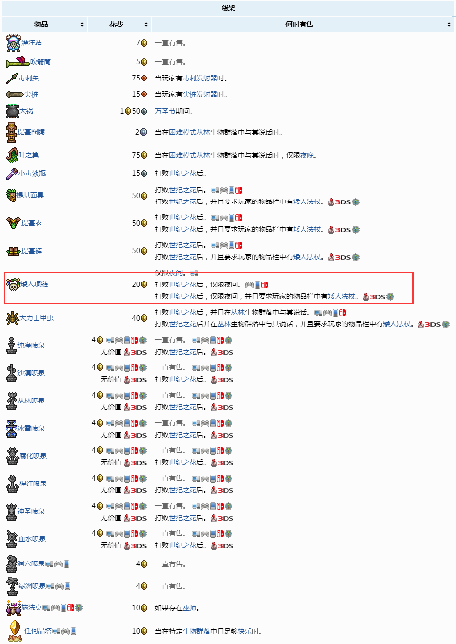 俾格米項鏈(矮人項鏈)可以為玩家提供一個額外的僕從位,獲得方法為在夜晚以20金的價格從巫醫處購買,玩家必須打敗世紀之花後巫醫才會出售此物品。售賣價格可以通過裝備優惠卡或貪婪戒指來降低,還會基於NPC的快樂程度而升降。玩家可在巫醫處購買如下物品: