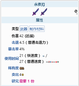 首頁 泰拉瑞亞 問答 泰拉瑞亞永夜之刃屬性是什麼? 2022-11-12 永夜刃是打敗骷髏王後可以獲得的武器,基礎傷害值高,適合戰士職業的玩家使用,具體屬性如下。在困難模式後,永夜刃還可用於製作武器泰拉刃。