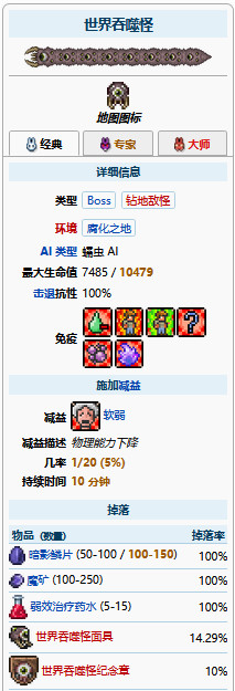 暗影碎片是通過打世界吞噬怪獲得的玩家,可以通過召喚出世界吞噬怪擊敗他得到,並且暗影碎片並不需要完整的擊敗一個世界,吞噬怪它只需要擊敗世界吞噬怪的一些體節,每一個體節大概都能獲得1~3個暗影碎片,玩家也可以在腐化之地敲暗影珠來召喚世界吞噬怪。