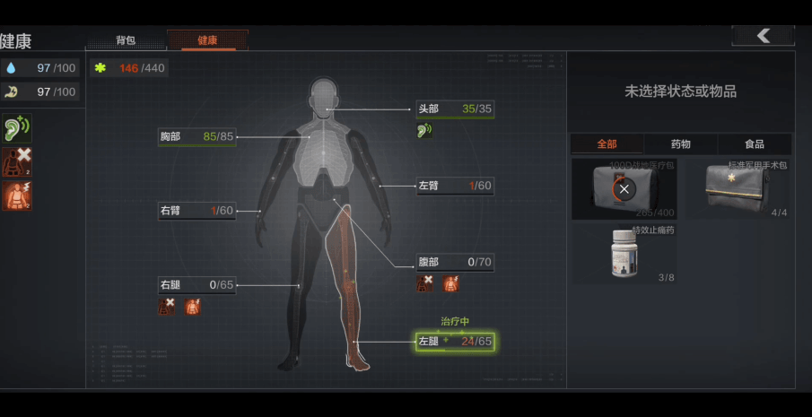 如同預告片中,最後的勝利者拖著受傷的軀體踉蹌前行。《暗區突圍》也在戰局中模擬第一人稱負傷反饋。身體不同部位受傷,會對角色造成不同的行為影響。如:腿部損壞會影響人物行進速度,受傷帶來的劇烈疼痛會使角色視線模糊,創口、缺水會使角色健康值持續下降等等。一切負面狀態可以通過藥品補給恢復,時刻警惕每一個身體反應,方有機會成功突圍!