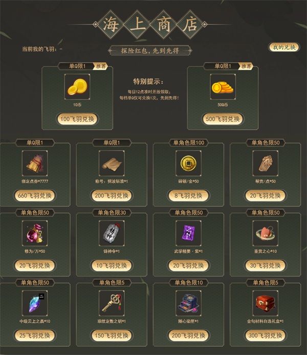 飛羽妙用不僅如此,還可以在活動中的【海上商店】兌換限量探險紅包、7777綁定點券、劈波斬浪稱號、金句材料自選禮盒等超多道具!
