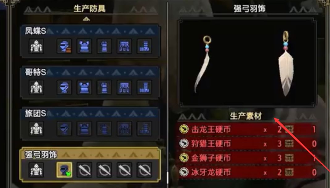 3.對話完後,即成功解鎖強弓羽飾,解鎖後製作這套強弓羽飾所需要的生產材料。