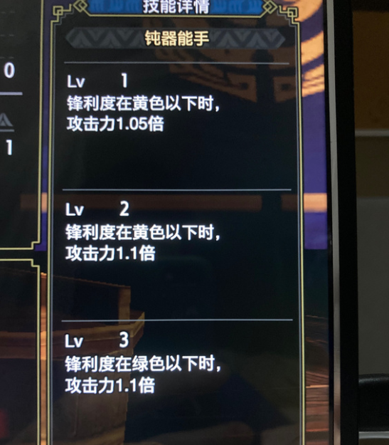 首頁 怪物獵人:崛起 問答 mhr鈍器能手包括綠斬嗎? 2022-11-15 鈍器能手包括綠斬,鈍器能手lv1鋒利度在黃色以下時攻擊力1.05倍,lv2鋒利度在黃色以下時攻擊力1.1倍,lv3攻擊力在綠色以下時攻擊力1.1倍,綠斬必須三級鈍器才有效,黃斬只需二級鈍器。