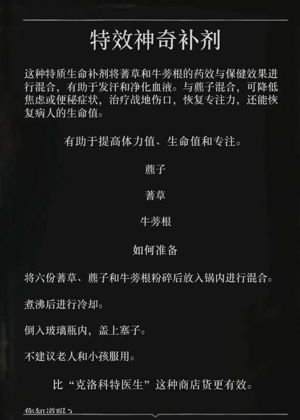 荒野大鏢客2中特效神奇補劑的配方是:將六份蓍草、麓子和牛蒡根粉碎後放入鍋內進行混合,煮沸後進行冷卻,倒入玻璃瓶內,蓋上塞子。