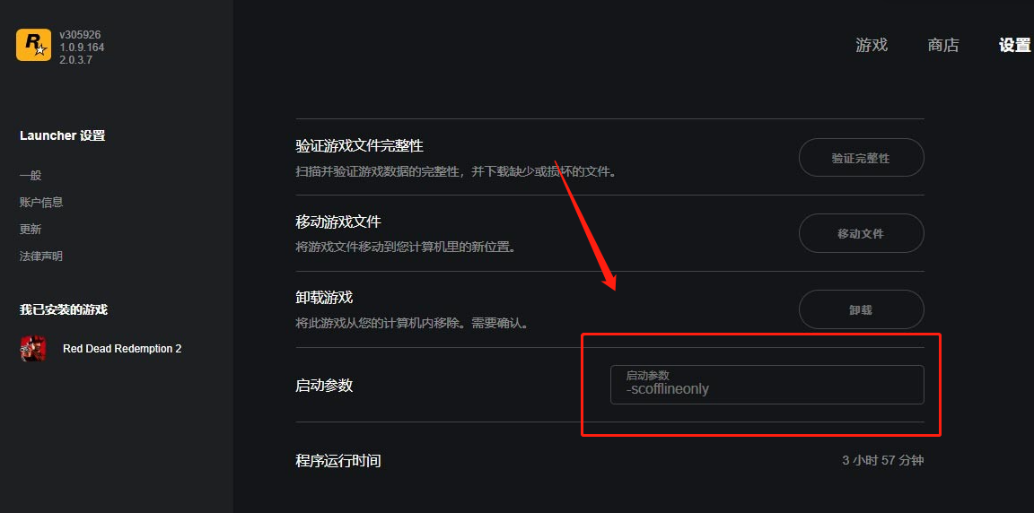 荒野大鏢客2PC端是可以進行離線模式的,在離線模式中玩家可以沉浸於單機模式,不被其他線上信息所干擾,獲得一個良好的游戲體驗。1、打開安裝好荒野大鏢客2後,如下圖點擊右上方的「設置」選項。然後在「我已安裝的游戲」中選擇荒野大鏢客2並找到「啟動參數」選項輸入-scofflineonly。