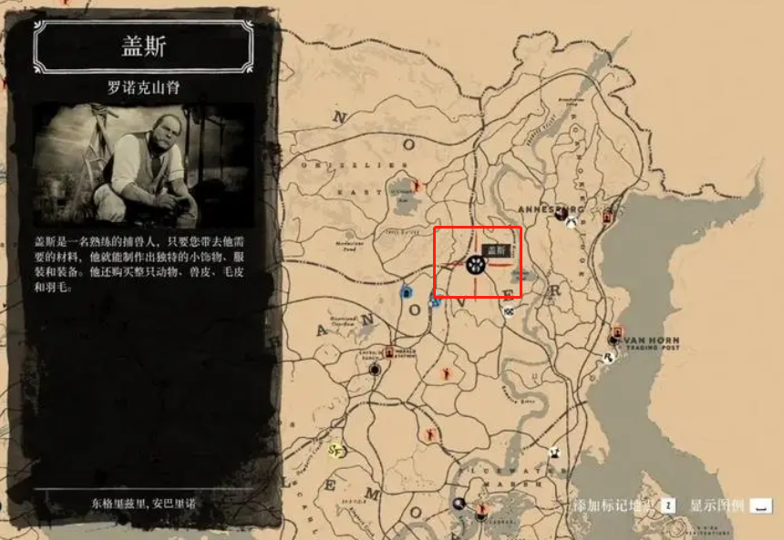 荒野大鏢客2游戲中,蓋斯位於地圖東北角的羅諾克山脊,玩家可以在老獵人蓋斯處通過出售動物屍體或皮毛獲得新的裝備以及飾品。