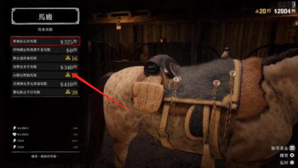 首頁 荒野大鏢客2 問答 荒野大鏢客2馬鞍怎麼買? 2022-11-26 馬匹的初始馬鞍不需要購買,只要在玩家獲得新馬匹後回到營地,然後通過睡覺完成存檔,馬匹就會自動刷新初始馬鞍。而高級馬鞍則可以通過各種任務來獲取,玩家可以在馬匹界面中按下「L2 ↑」鍵來取下馬匹上的馬鞍並進行更換。