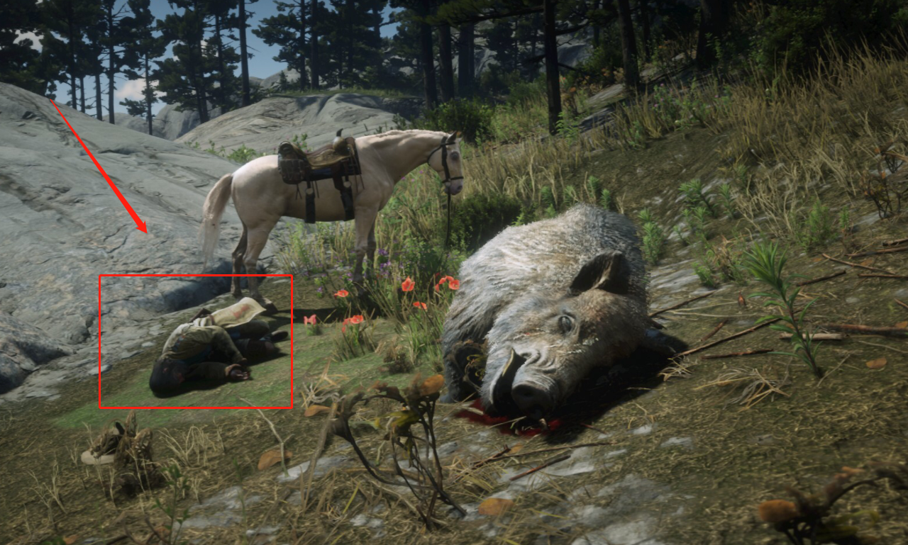 這是荒野大鏢客2的支線任務,老兵名字叫做哈米什,根據劇情來看沒有辦法不死。亞瑟走上山丘並調查了一隻狼的屍體,此時他聽到一聲槍響,一定是哈米什發現了公豬的蹤跡,之後騎馬並前往指定地點。到達指定地點之後,我們會看到哈米什倒在血泊之中,他最後的願望是,希望我們替他照顧他的馬布埃爾。之後公豬出現,使用死眼乾凈利落地解決它。
