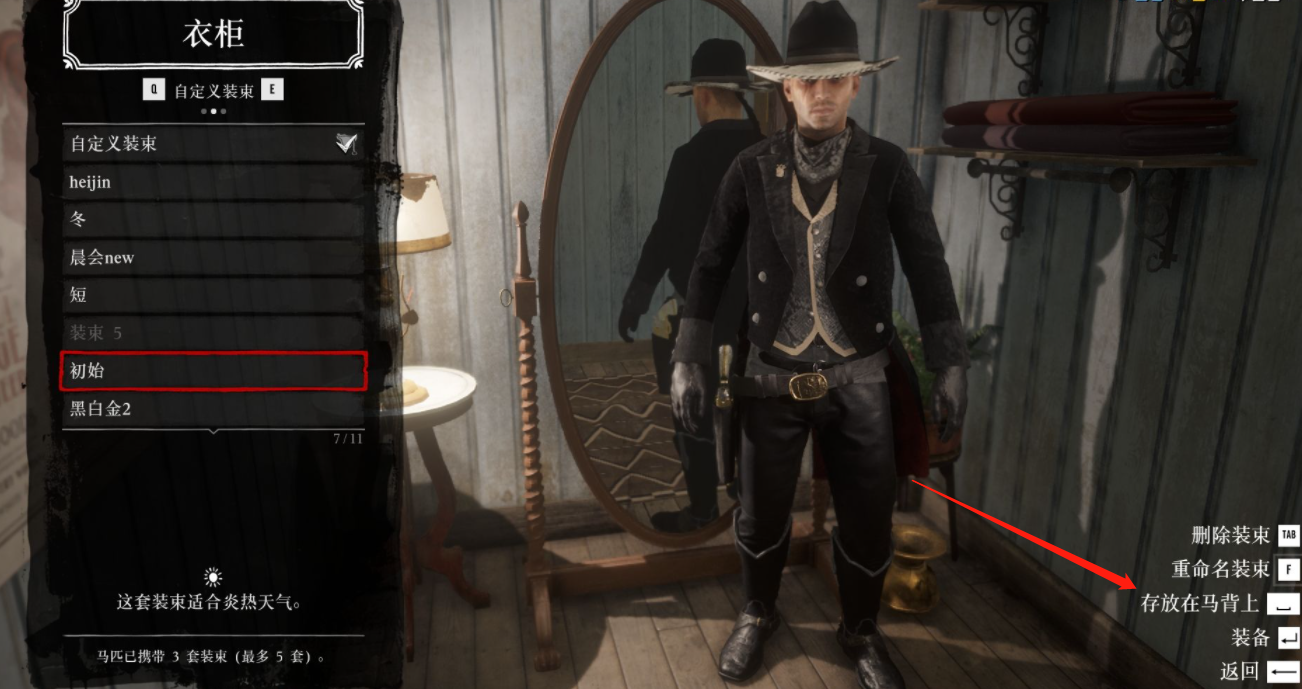 在馬匹上存放寒冷服裝總共有兩種方法:1、方法一 :如果提示沒有防寒服,可以試試在營地自己的帳篷換衣服,然後選擇保存在馬鞍,在馬上或者靠近馬鞍包按L1切換到物品,最下方按L2,R2切換衣服。2、方法二: 可以保存一套自定義衣服,靠近衣櫃,按L2,選中一套套裝,按R3存入馬鞍袋。