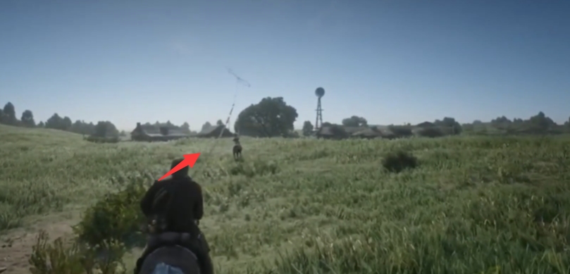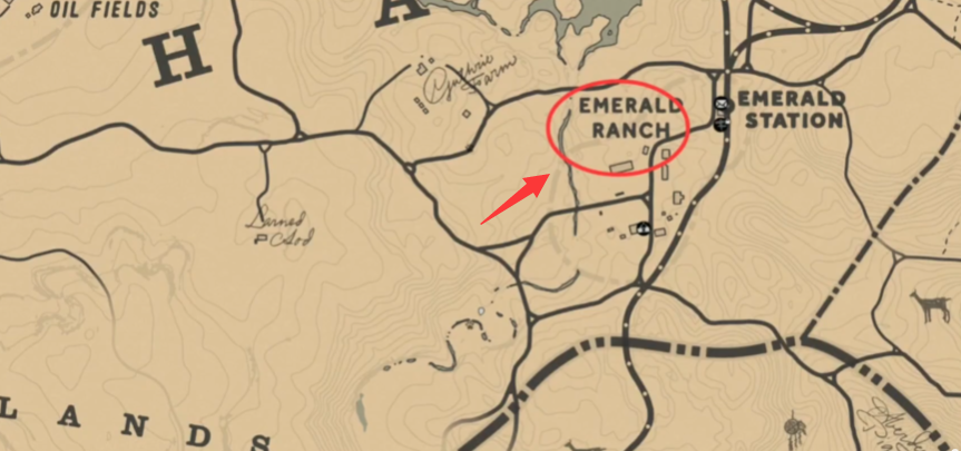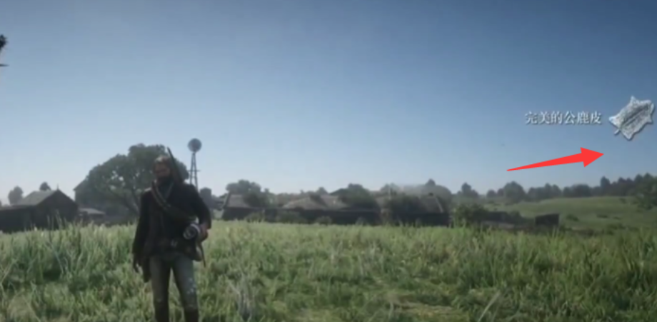 1、在荒野大鏢客2中完美鹿皮可以在翡翠農場打,具體位置如地圖箭頭所示。