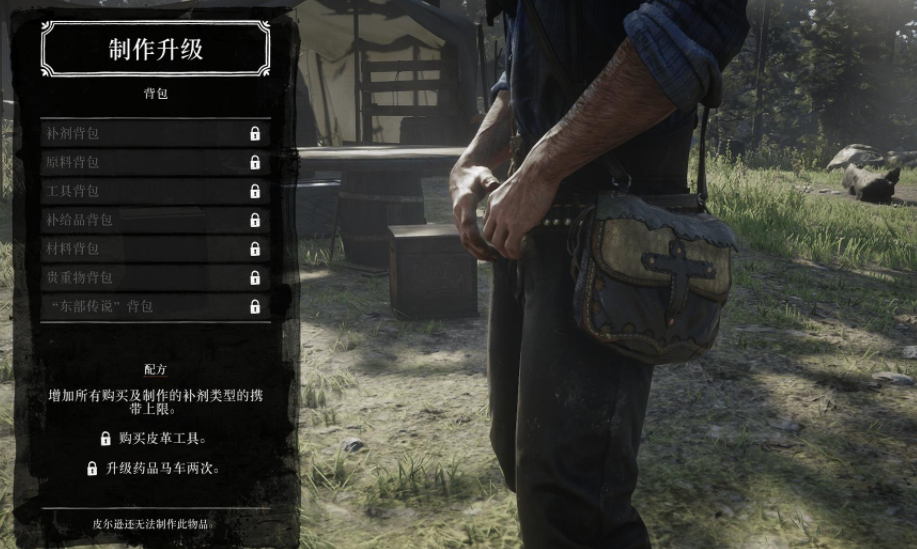 首頁 荒野大鏢客2 問答 荒野大鏢客2怎麼升級補給背包? 2022-11-28 荒野大鏢客2玩家想要升級補給背包可以找皮爾遜。1.首先,玩家需要進入游戲後,找到營地中的npc皮爾遜,然後選擇製作升級。2.最後就可以升級補給背包了。