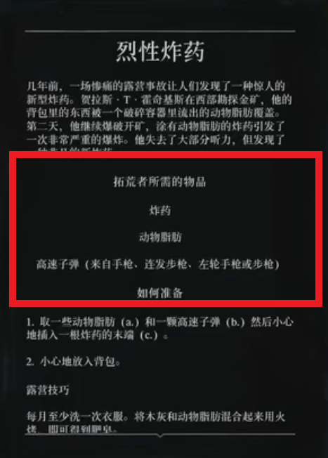 首頁 荒野大鏢客2 問答 荒野大鏢客2烈性炸葯配方是什麼? 2022-11-28 烈性炸葯拓荒者需要準備炸葯,動物脂肪以及來自於手槍、連發步槍、左輪手槍或者步槍的高速子彈。製作方法是將準備好的動物脂肪以及一顆高速炸彈小心插入一跟炸葯的末端。
