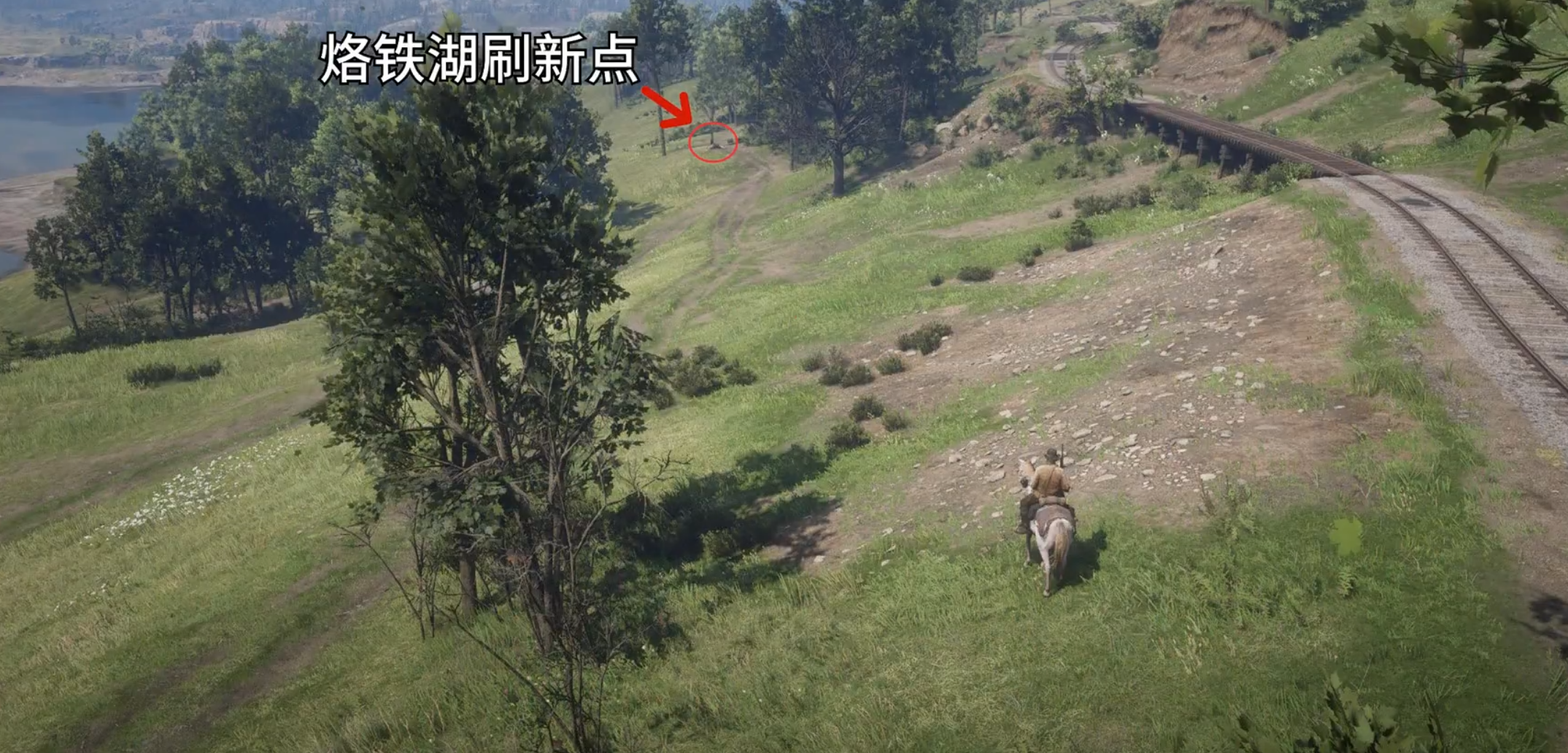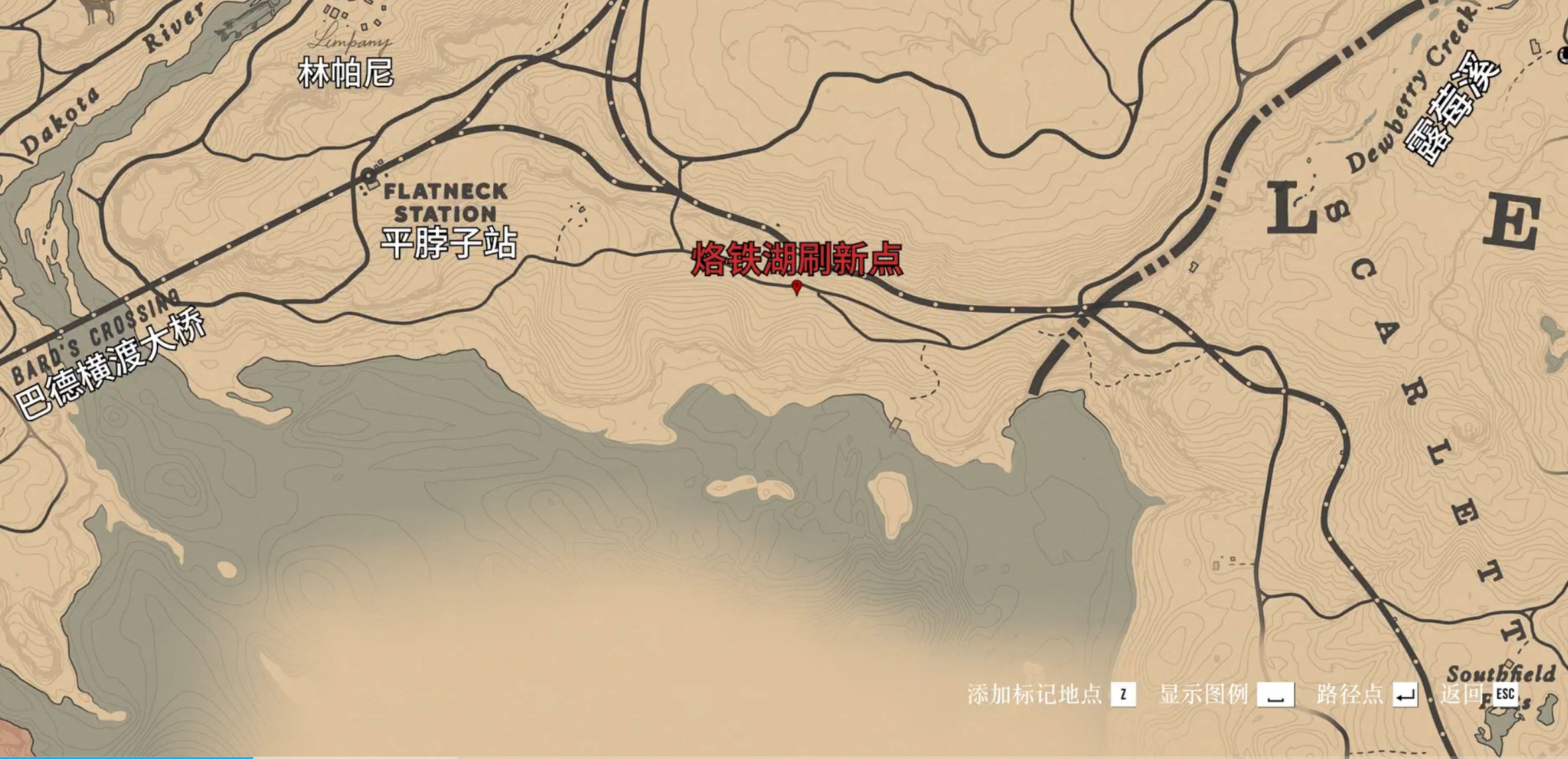 1、玩家來到平脖子站東邊的烙鐵湖,刷新點位於鐵軌邊的三岔路口,我們要繞過刷新點,以免觸發這個隨機事件。