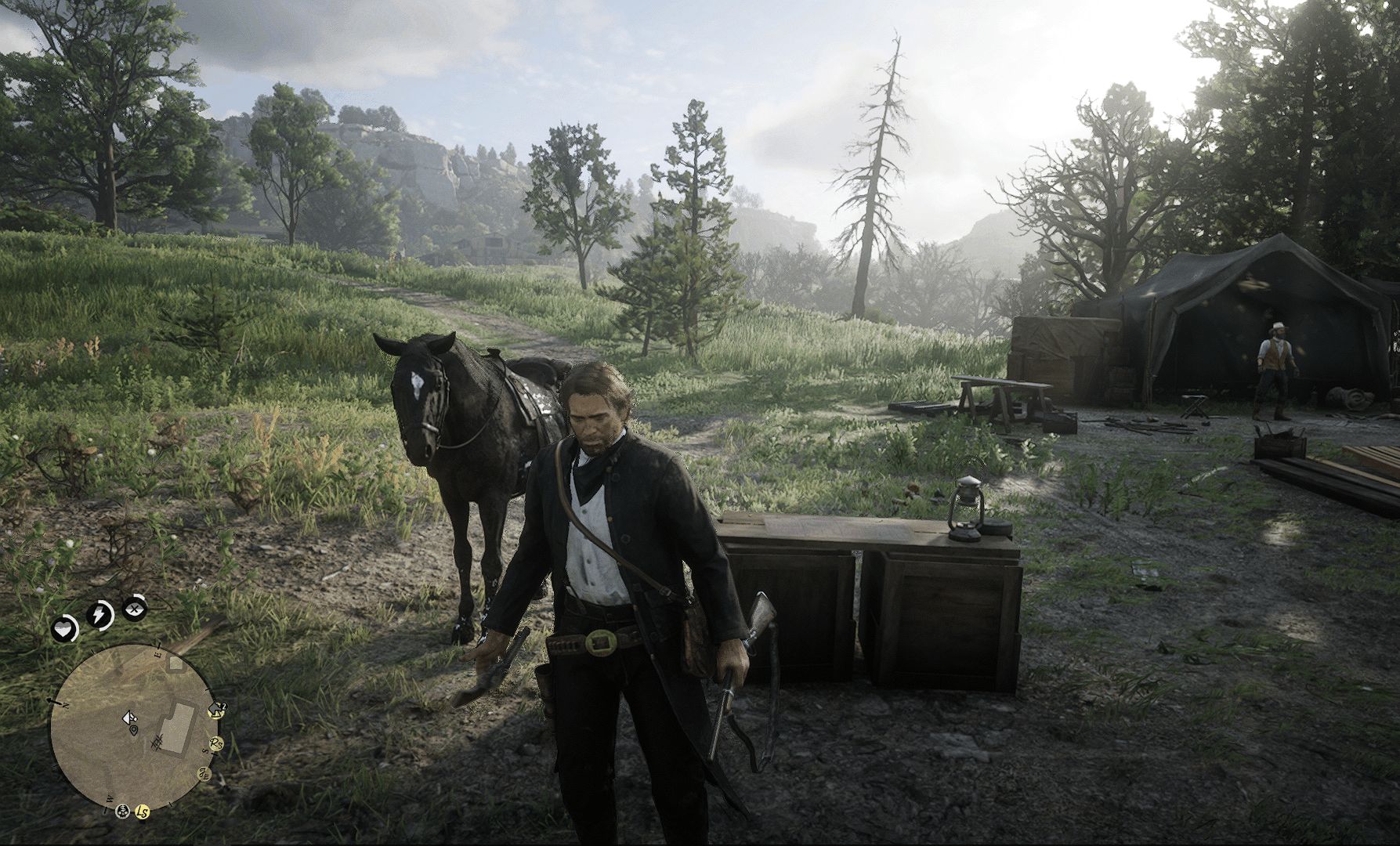 3、在手持武器的時候,玩家需要連按兩下LB鍵,在手柄上是瞄準鍵下面的按鍵,也就是按兩下武器欄鍵,主角就會將手中的左輪轉兩下,然後放回槍套中。