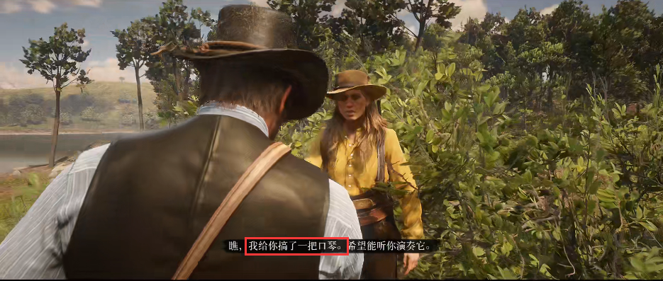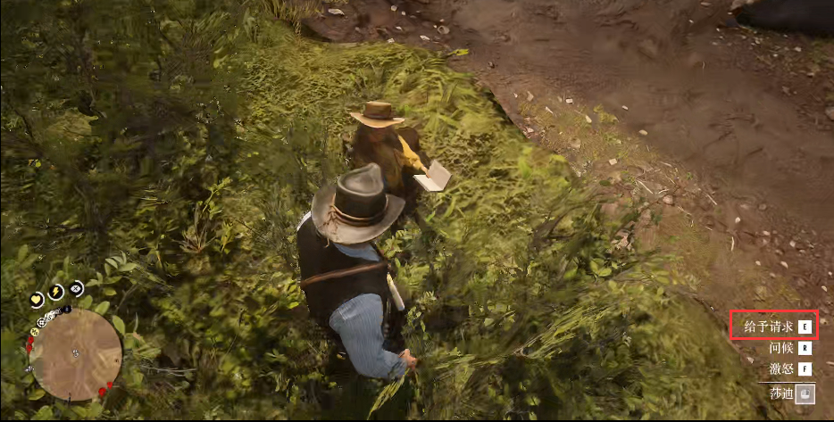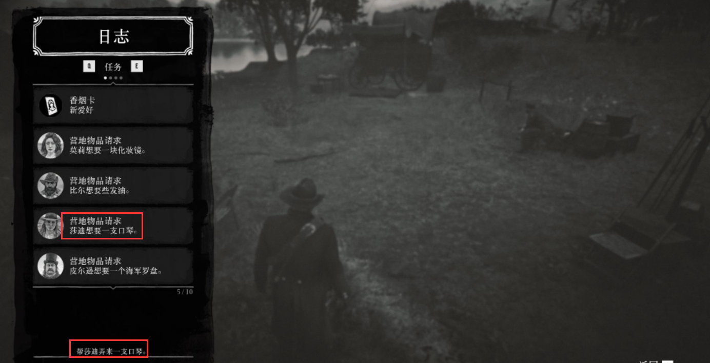 1.大鏢客2把物品給營地隊友的方法是按【E】鍵對話實現,如圖營地莎迪需要一支口琴