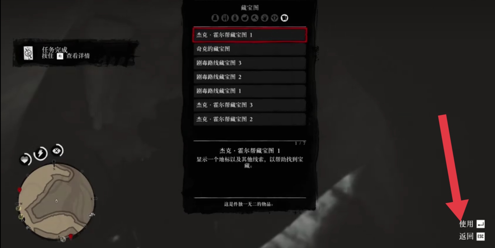 首頁 荒野大鏢客2 問答 荒野大鏢客2藏寶圖怎麼看? 2022-12-06 荒野大鏢客2藏寶圖查看方法步驟如下:1、玩家進入游戲後,根據提示首先獲得藏寶圖,然後打開背包,選中藏寶圖,如下圖所示:2、根據右下角提示,按下回車鍵來打開它,如下圖所示,這樣就可以成功打開藏寶圖,查看藏寶圖的內容了。