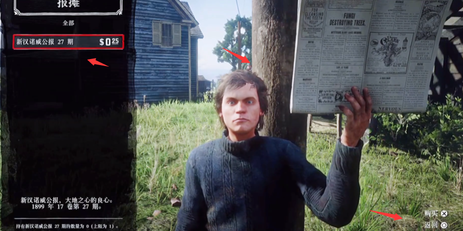 首頁 荒野大鏢客2 問答 荒野大鏢客2報紙在哪買? 2022-12-06 1、荒野大鏢客2中賣報人的具體位置如地圖上箭頭所示,在瓦倫丁的鎮子上。2、當玩家來到這里之後,在一個柱子前就可以看見一個賣報人,在他這里就可以買到報紙。