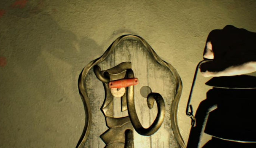 3、回到密碼門的房間,那裡也有一個相同的架子,使用一樣的辦法,獲得提燈鉤子B。使用刀子將貼在投影機上的膠帶割開,把提燈放進去形成光源。