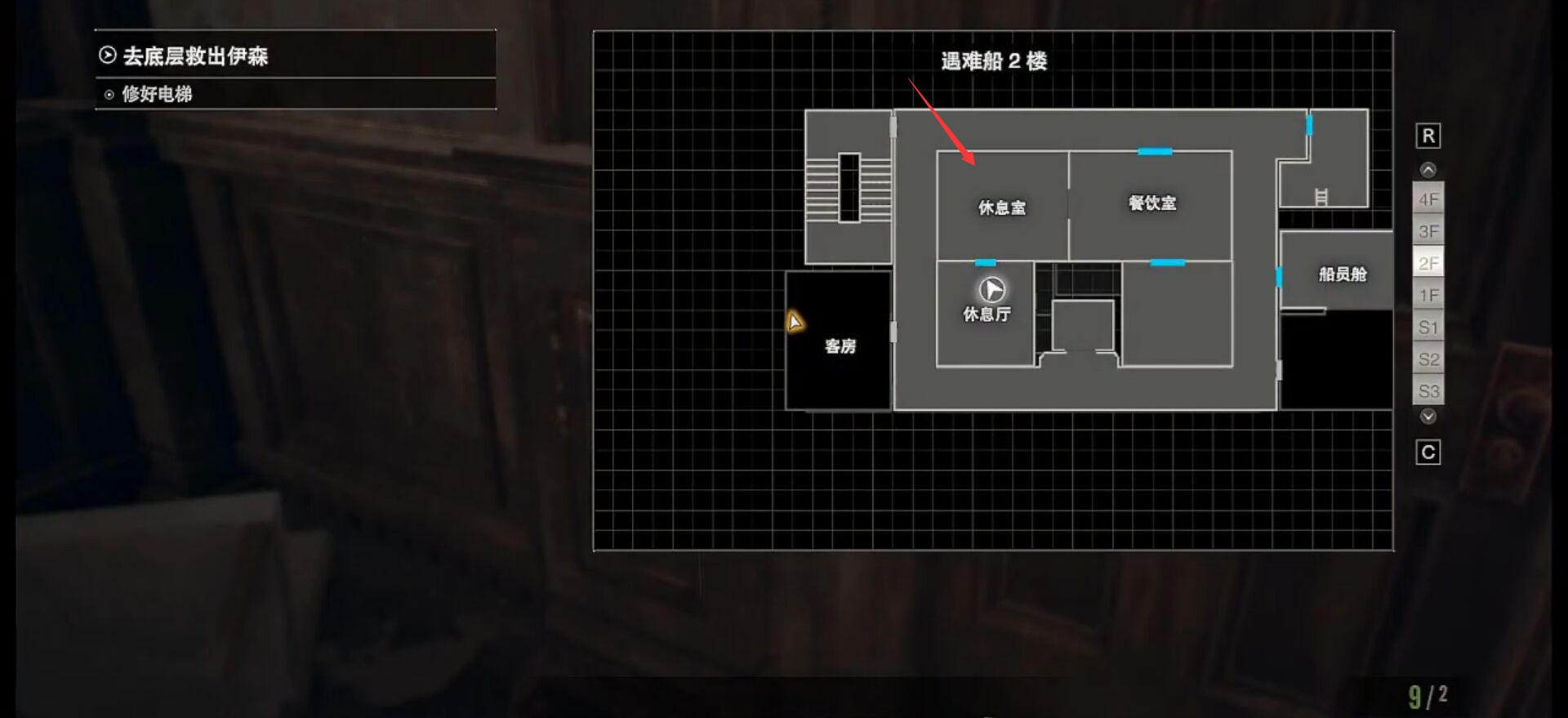 2、我們根據地圖的走向可以找到休息室的位置,白色圓圈中的箭頭指向我們此時的朝向,白色圓圈就是我們此時所在的位置