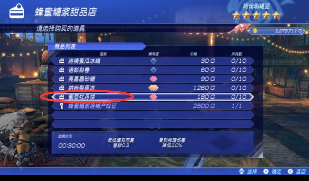 玩家可以在「阿伐利緹亞商會」一樓的蜂蜜糖漿甜品店購買,但是玩家需要產權證解鎖才能購買;蜜豆牡丹餅是結喜歡的物品,是個分支任務。