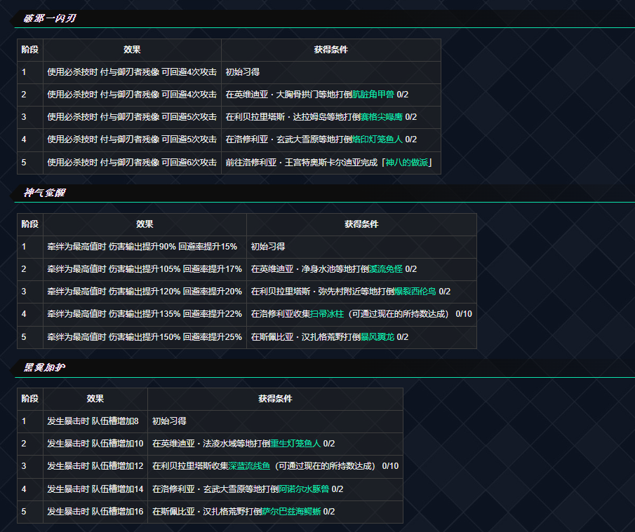 首頁 異度之刃2 問答 異度之刃2神八羈絆怎麼解鎖? 2022-12-11 神八自身的羈絆圓環分別有降魔照破斬、穿暗黑羽衣、破邪一閃刃、神氣覺醒、黑翼加護、瞬時攻擊、光屬性之力、森林學以及古代文明的知識,具體解鎖方式可以查看下圖了解。