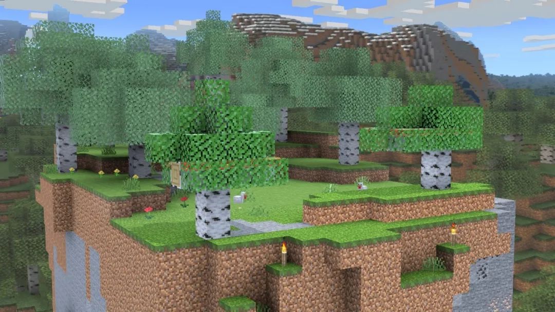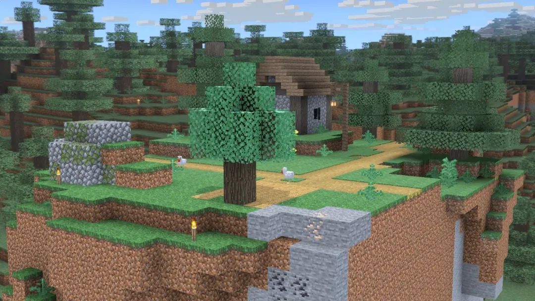 《我的世界》最基礎的生態域「草原」,背景可以看到村民活動,入夜之後為了防備怪物就會回到家中。