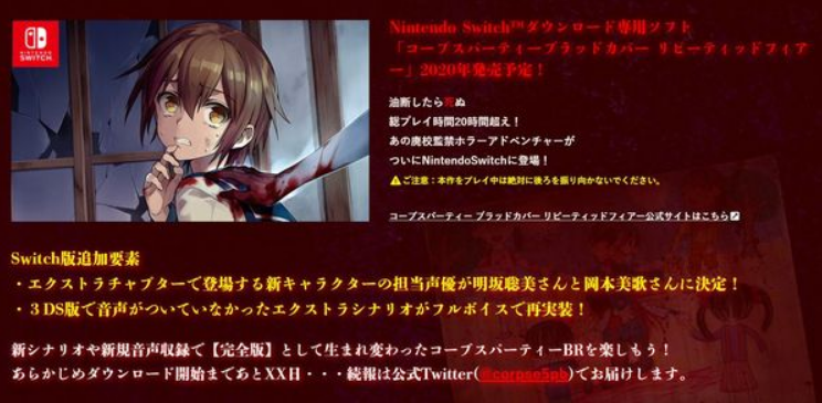 《屍體派對:血腥籠罩之恐懼再現》官方宣布將移植至Switch平台,預計將於2020年內發售。Switch版較PSP/3DS版強化了語音,Extra章節登場的新角色將由明坂聰美與岡本美歌配音,3DS版沒有聲音的Extra劇情將改為全語音演繹。