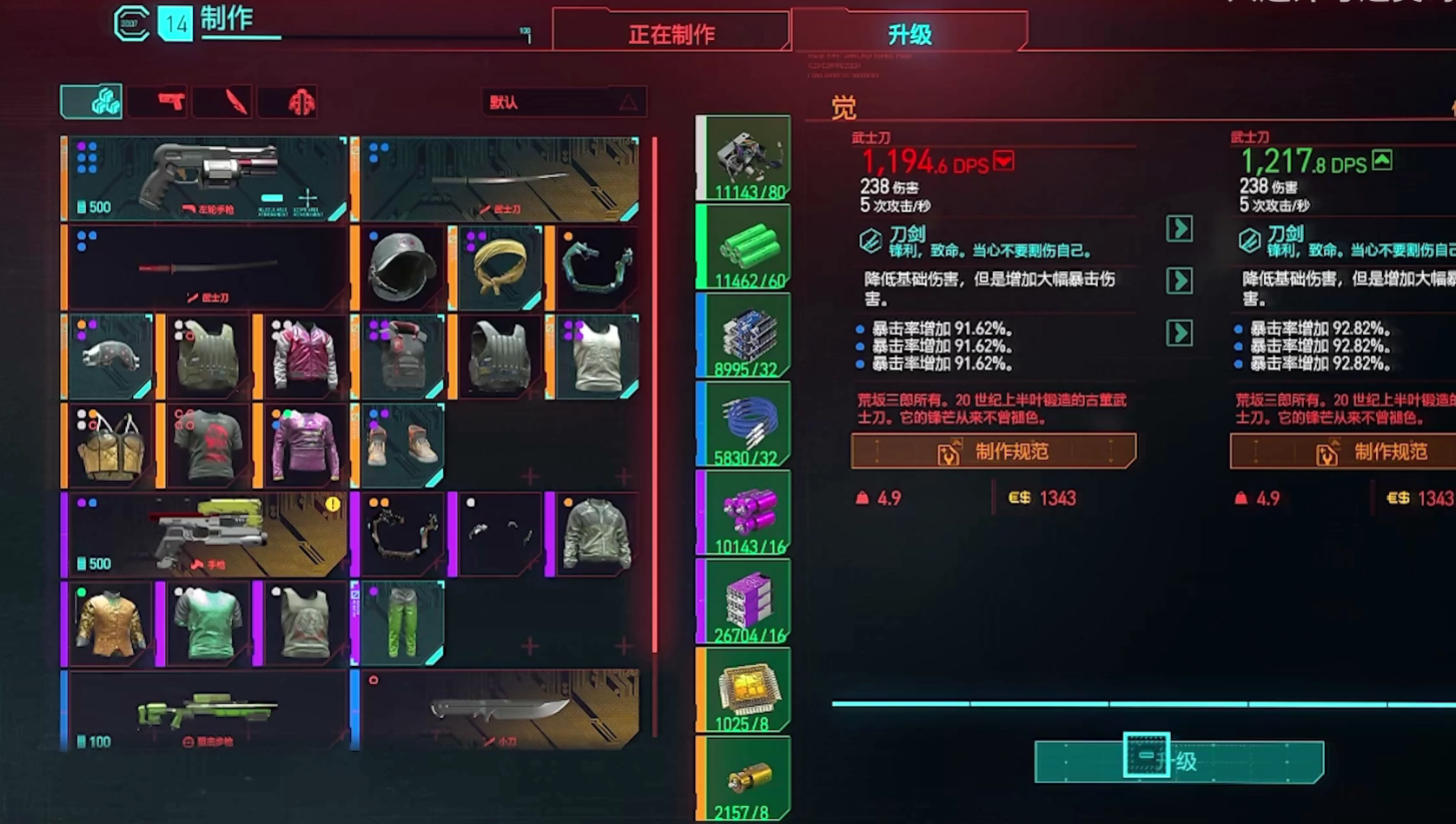 首頁 賽博朋克2077 問答 賽博朋克2077怎麼給武器升級? 2022-12-18 進入游戲後,點擊I鍵呼出菜單,再移動鍵鼠到製作菜單欄後左鍵點擊確認,然後在製作界面選擇升級界面,選擇自己需要的物品並准備相應材料和製作技能即可完成升級。