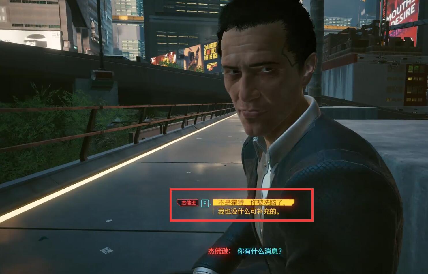 首頁 賽博朋克2077 問答 賽博朋克2077傑弗遜要告知真相嗎? 2022-12-18 不一定要告知。如果選擇不告訴傑弗遜真相,這個支線任務就結束了。如果選擇告訴他真相,在主線大結局後,會接到他的電話,說他自己知道被洗腦了,隨後信號就被切斷。所以不管怎麼選擇,都看不到故事的結果,玩家根據自己的喜好選擇即可。