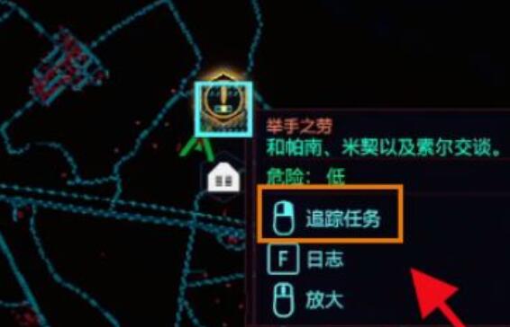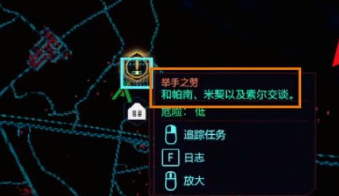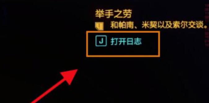 首頁 賽博朋克2077 問答 2077舉手之勞任務怎麼觸發? 2022-12-20 賽博朋克2077舉手之勞任務的觸發方法:1、首先打開賽博朋克2077游戲,按J鍵打開「日誌」。2、再點擊滑鼠左鍵選擇追蹤任務。3、接著和索爾等三人交談,就觸發舉手之勞任務。