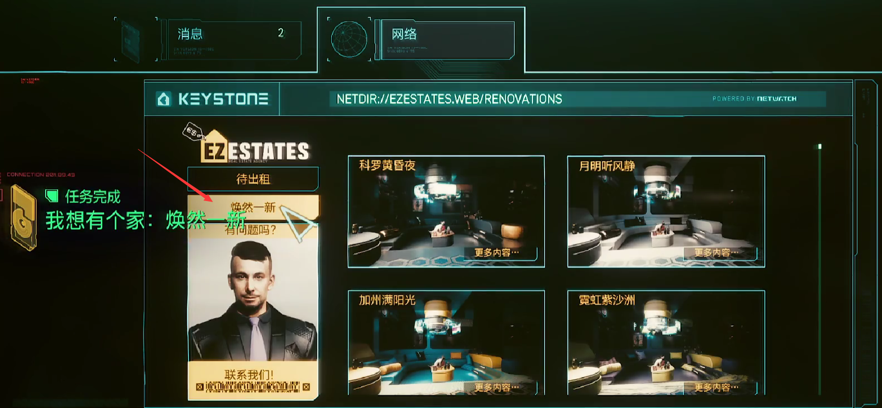 1.玩家在賽博朋克2077的我想有個家:煥然一新任務中,需要前往超級大樓H10的第一個公寓中找到電腦,點擊F進行使用。
