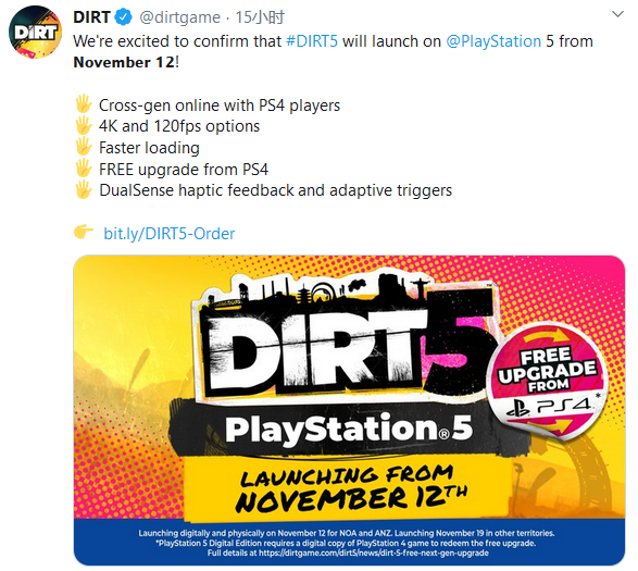 根據官方公開的消息,《塵埃5》確認將於2020年11月12日登陸PS5平台,此外,該版本將支持4K解析度和120FPS選項,同時將支持DualSense手柄觸覺反饋、自適應扳機功能,還會擁有更快的載入速度。