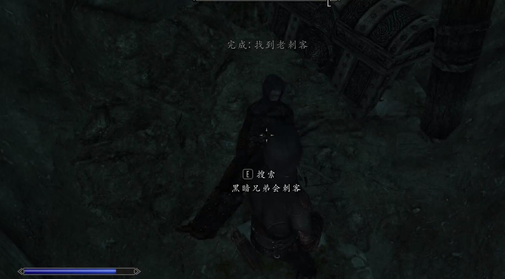 3、進去探索完整個洞穴後,然後找到黑暗兄弟會老刺客,直接按「E」搜索,裝備全在他身上