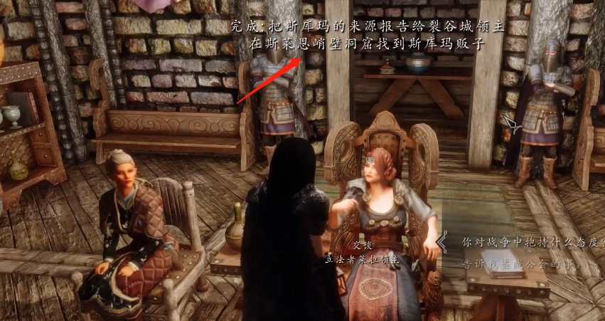 進入後找到立法者萊拉領主進行交談告知斯庫瑪販子的事情,獲得倉庫鑰匙
