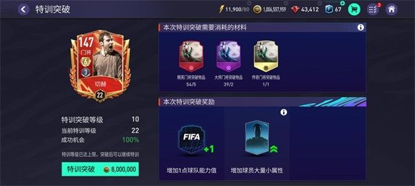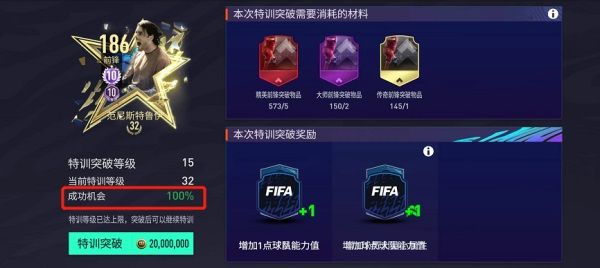 特訓突破消耗的材料隨特訓等級提升而提升,消耗材料為精英/大師/傳奇/至尊 前鋒/中場/後衛/門將突破物品。夏日球迷嘉年華新版本中,我們還優化了突破失敗後,二次點選材料的繁瑣操作,當玩家集齊突破球員所需的突破材料後,突破的成功機會可以達到100%,不會突破失敗。