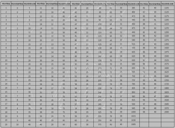 球員特訓養成體系共計98級,每兩級之間需要進行一次突破方可繼續提升等級。即單個球員總計需要提升98次特訓等級並進行49次特訓突破方可達到滿級。每次提升球員特訓等級均可提升球員小屬性,每次特訓突破可以增加球員小屬性與球隊能力值或球員能力值。