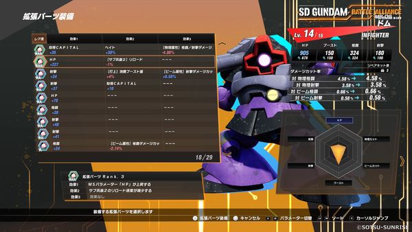 由於強化過的機體也可配合自己的遊玩風格,將能力值轉換成調整點數,再次進行分配,玩家可盡情依照個人的遊玩風格進行強化及調整。