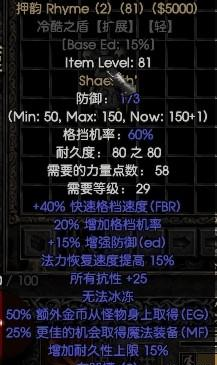 符文順序13 5,底材要求盾牌,加大量的格擋和抗性,無法冰凍,最重要還有25的MF,前期堆MF很好的盾牌。