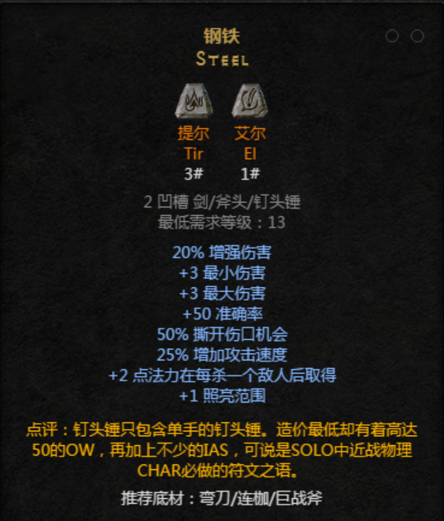 暗黑2鋼鐵符文之語是一把物理系的武器,暗黑2符文之語鋼鐵合成公式:兩孔劍、斧頭、釘頭錘:3號提爾 1號艾爾,物理系武器最重要的屬性,攻擊,攻速,準確,符文之語鋼鐵全都有。前期因為武器本身的基礎傷害低,所以加最大最小傷害,要比百分比加傷害更好。