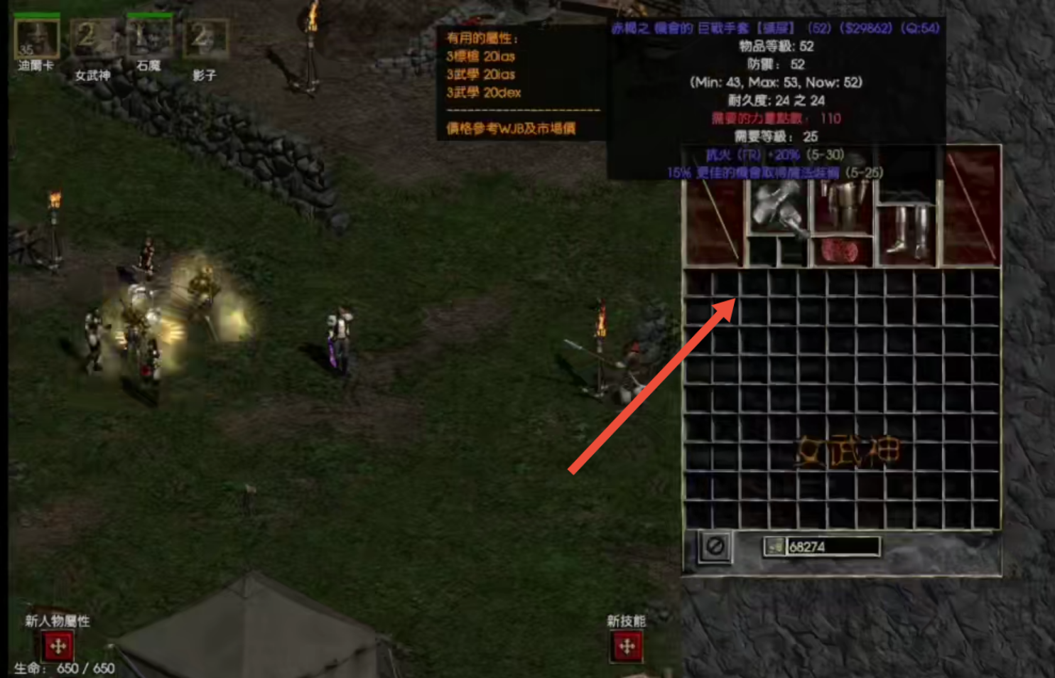 首頁 暗黑破壞神2 問答 暗黑2怎麼看女武神裝備? 2022-12-28 1、對著帶裝備的寵物,例如鐵魔,女武神,影子,按 K 鍵,即可查看身上裝備,如下圖,玩家首先點擊女武神使其出現在界面;2、然後再對著界面中的女武神,按K鍵即可查看其准備。