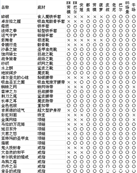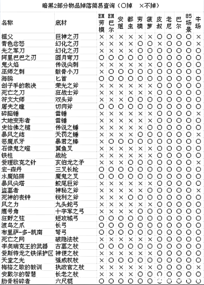 首頁 暗黑破壞神2 問答 暗黑破壞神2boss掉落列表是什麼樣的? 2022-12-28 【暗黑破壞神2】boss掉落物品列表如下圖,不同boss掉落的物品不盡相同,其中○表示掉落物品,×表示不掉落物品,大家可以參考。